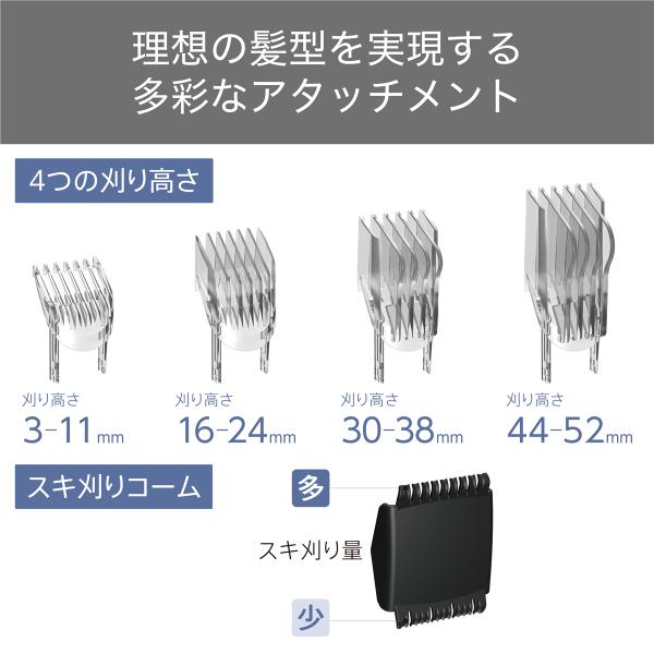 ■手元のダイヤルを回すだけで1mmずつ長さ調節が可能。選べる4種類のアタッチメントと組み合わせて、刈り高さ幅3mm〜52mmに対応。セルフカットでも手軽に理想の髪型を実現できます。