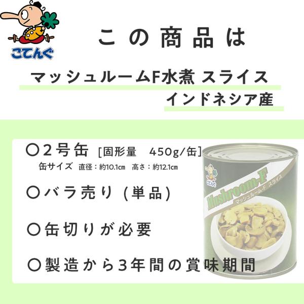マッシュルームF水煮 缶詰 インドネシア産 スライス 2号缶 固形450g バラ売り 天狗缶詰 業務用 食品