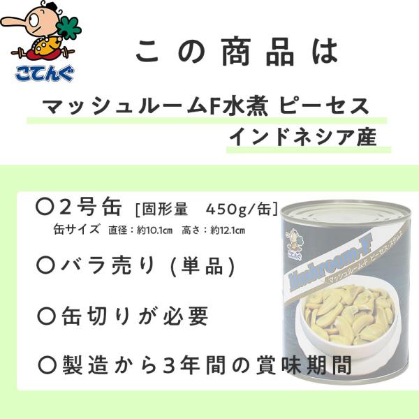 マッシュルームF水煮 缶詰 インドネシア産 ピーセス 2号缶 固形450g バラ売り 天狗缶詰 業務用 食品