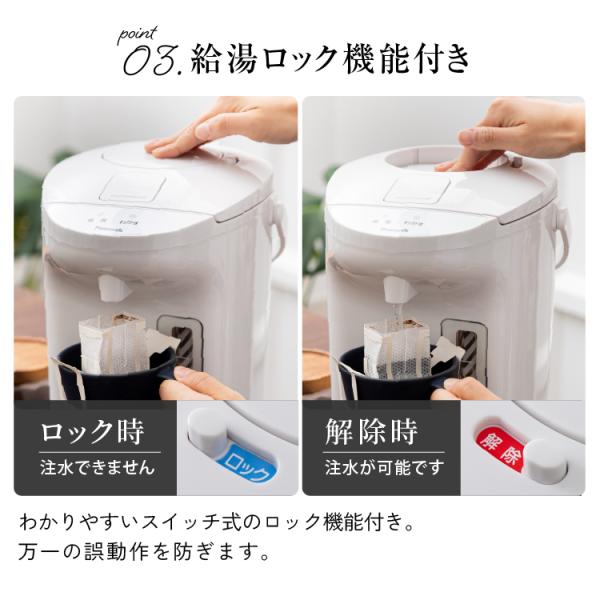 ・コードレス給湯…エアー給湯式なので、電源コードがささっていない状態でも注げます。