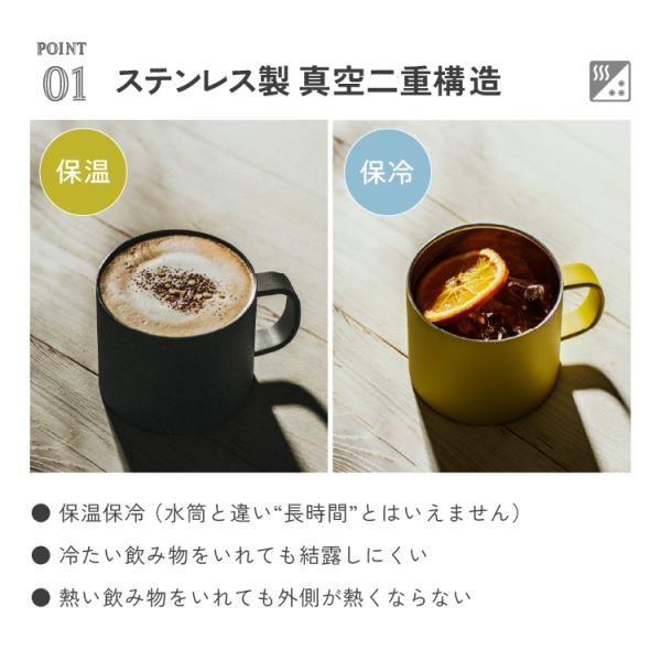 ・ステンレス真空二重構造。冷たい飲み物を入れても結露しにくく、温かい飲み物をいれても外側が熱くなりません。