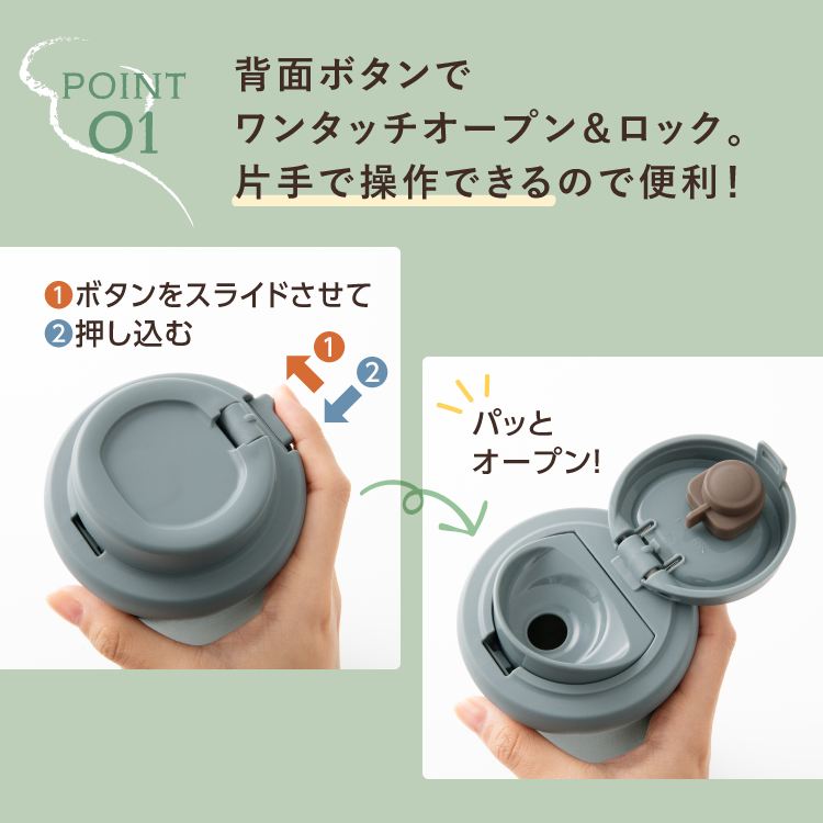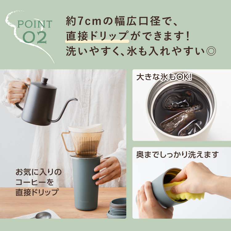 ・ボトルの口径は約7cmの広口タイプで、飲みものや氷が入れやすい。スポンジでのお手入れもしっかりできます。