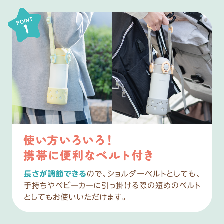 ・キュートな星形の型抜きデザインが入ったシリコーン製の底カバー付き。ボトル底面を傷や衝撃から守ります。