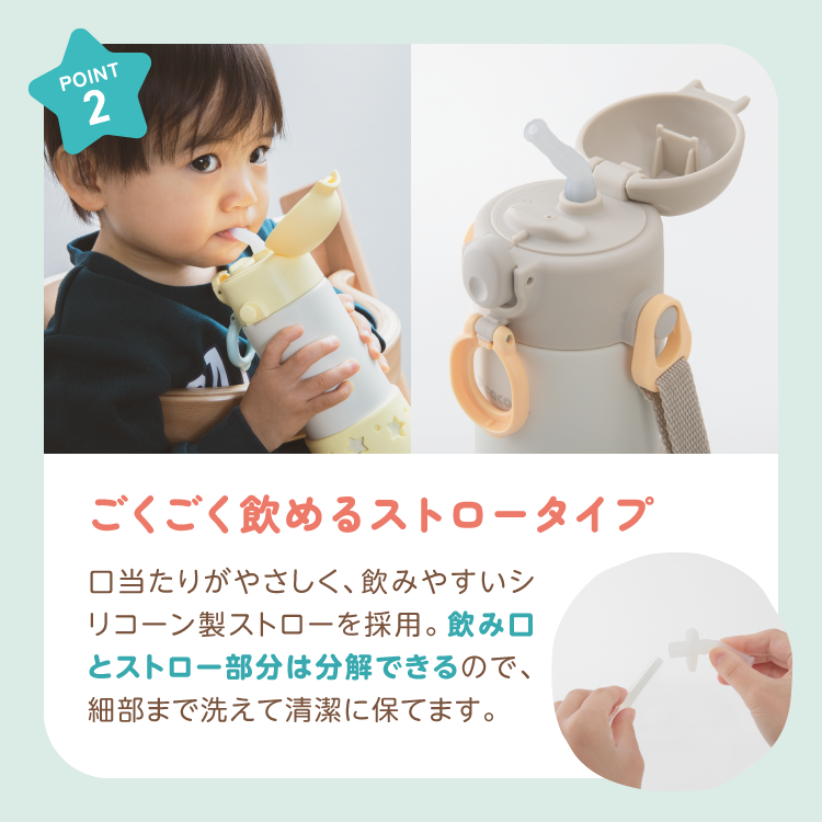 ・小さなお子さまがごくごく飲みやすい、やわらかなシリコーンストロータイプ。