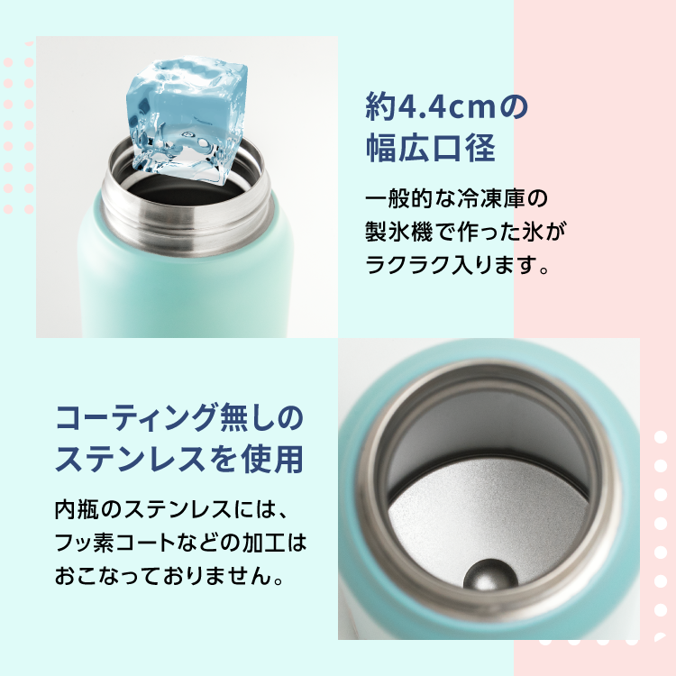 ・瓶の口径は約4.4cmで、飲みものや氷が入れやすい。