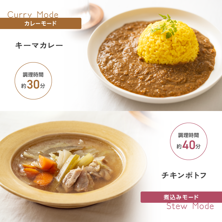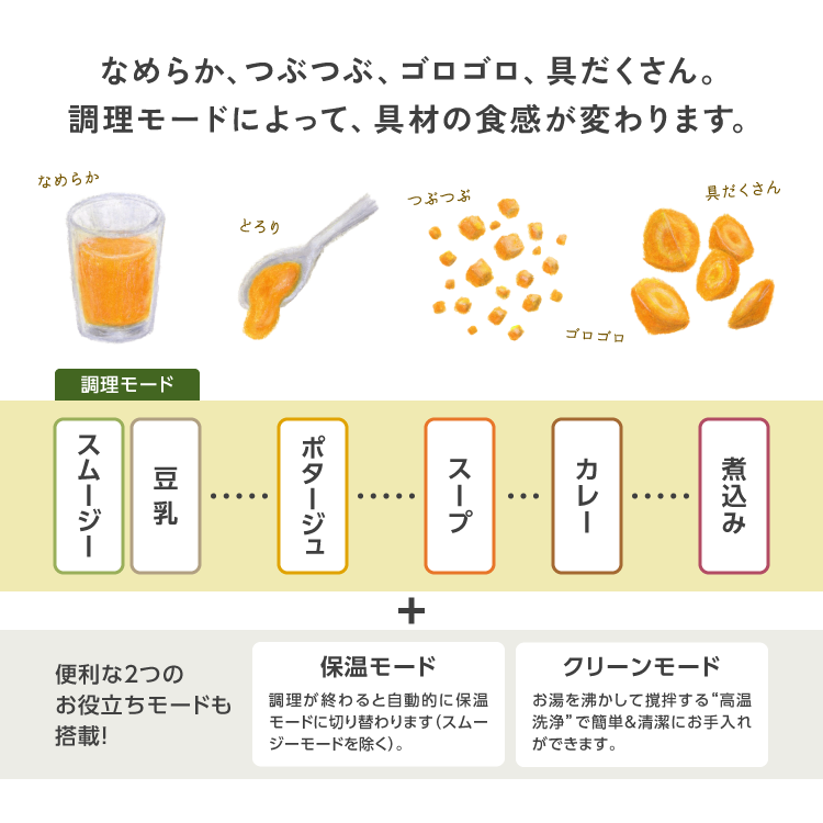 ・6つの調理モードで、スープ以外のメニューにも対応。スムージーから離乳食、手作り豆乳、ゴロゴロ具材の煮込み料理まで作れます。