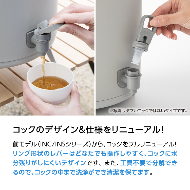 ・レバーコックを手前に引くだけで簡単に注ぐことができます。工具なしで簡単に分解できるので、中までしっかり洗浄できます。