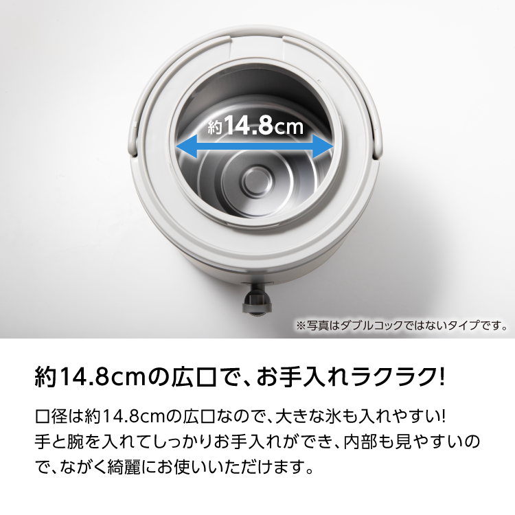 ・容器の口径は約14.8cmの広口設計。大きな氷も入れやすく、手を入れてしっかり洗えます。
