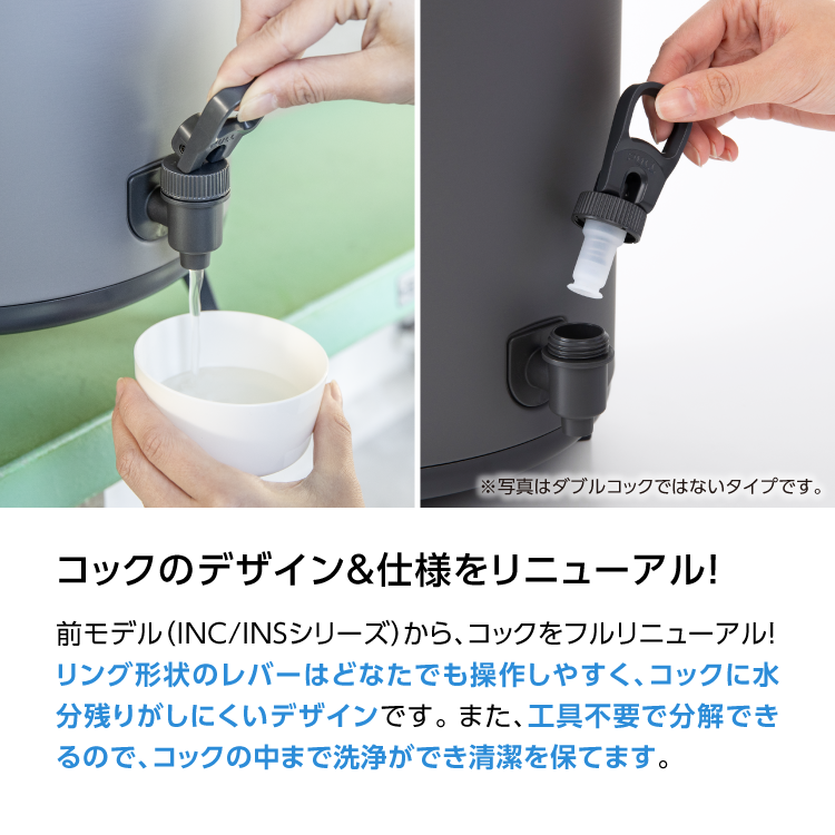 ・レバーコックを手前に引くだけで簡単に注ぐことができます。工具なしで簡単に分解できるので、中までしっかり洗浄できます。