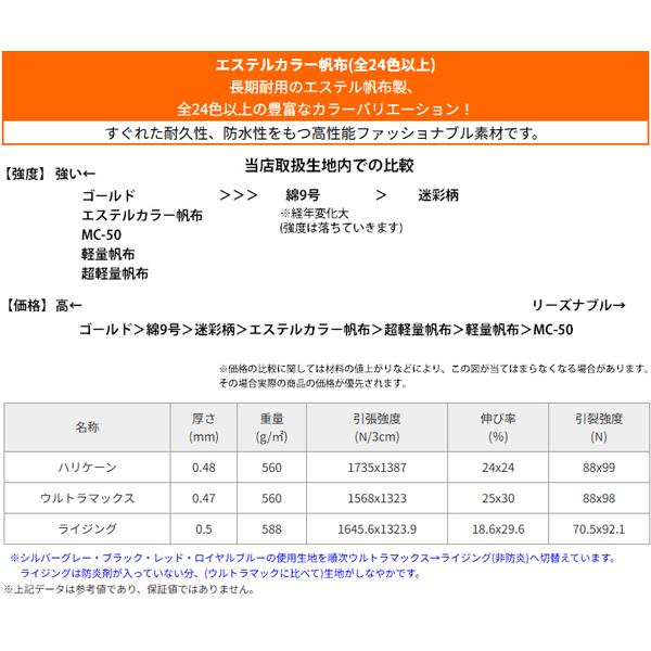 ●生地:エステルカラー帆布(ハリケーン/ウルトラマックス/ライジング)ターポセット加工・汚れ防止コート付・光沢あり