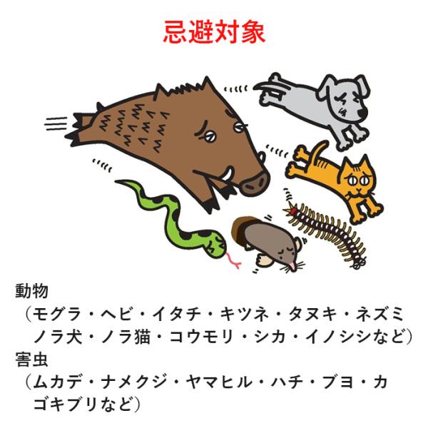 忌避対象:動物(モグラ・ヘビ・イタチ・キツネ・タヌキ・ネズミ・ノラ犬・ノラ猫・コウモリ・シカ・イノシシなど)