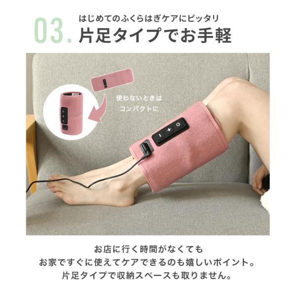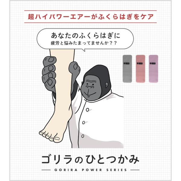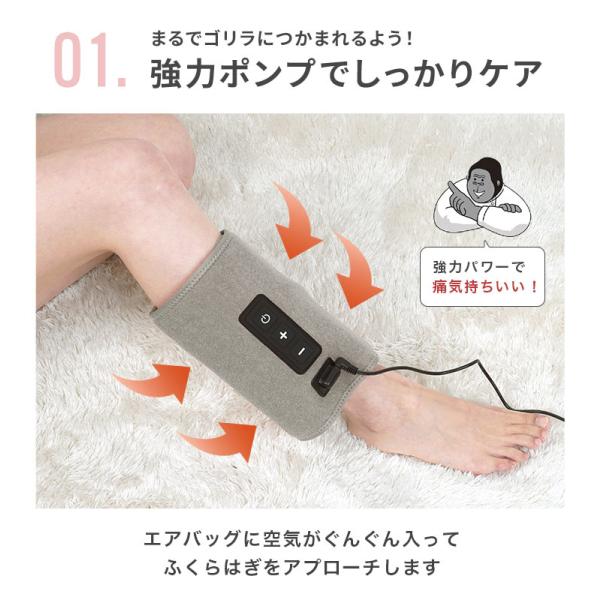 まるでゴリラに掴まれたかのような超ハイパワーがふくらはぎをケア!エアバッグにぐんぐん空気が入ってふくらはぎにアプローチします。足にぐるっと巻いてスタートボタンを押すだけの簡単操作。強さも3段階から選べます。片足タイプだから初めての方もお手軽に使用できます。マッサージのお店に行く時間がなくてもお家ですぐに使えてケアできます♪コンパクトに畳めるので収納スペースも取りません。