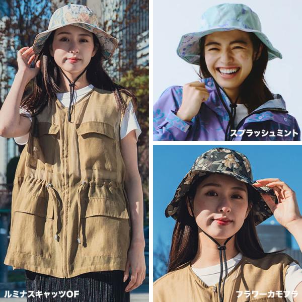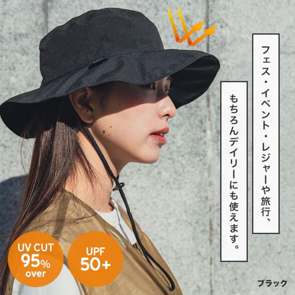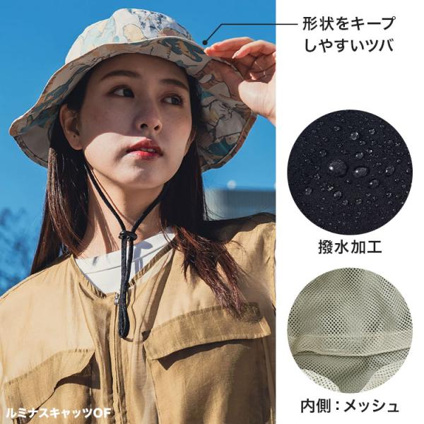 ドローコード付きあご紐でフィット感を調整でき、UPF50+とUVカット90%以上で紫外線対策も万全です。