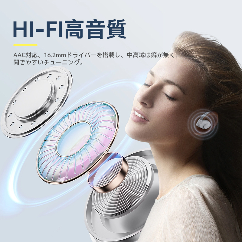 【オープンイヤーイヤホン設計】オープンイヤー型デザインで、耳に優しくしっかりとフィットします。 インイヤー型や骨伝導イヤホンbluetoothと比較して、心地良い開放感と自然かつ大迫力のサウンドをご堪能いただけます。