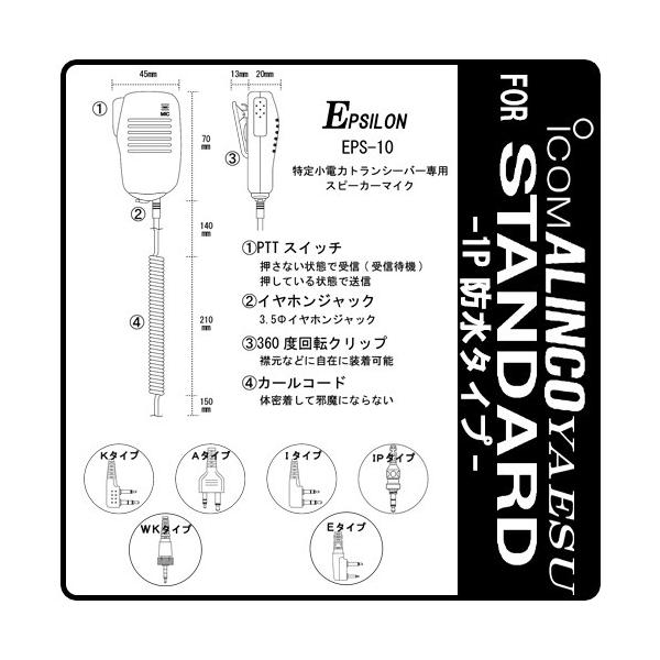 STANDARD/ICOM/ALINCO/スタンダード/アイコム/アルインコ 特定小電力トランシーバー用 スピーカーマイク インカム EPSILON EPS-10-1P