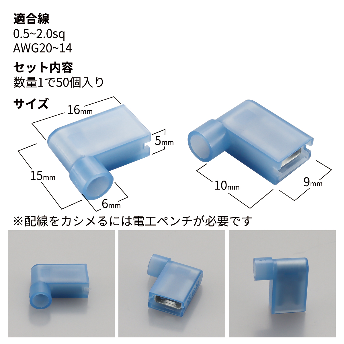 絶縁キャップ付きの250型旗型圧着端子が50個入ったセットです。