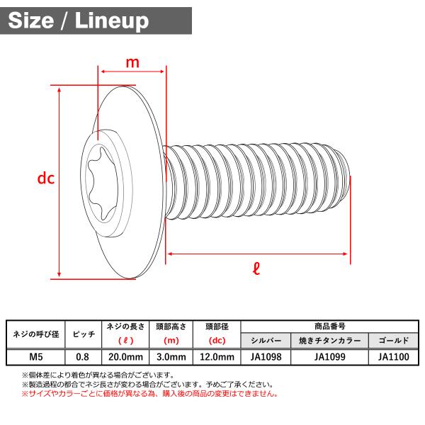 チタンボルト M5×20mm P0.8 トルクス穴 ワイドフランジ ボタンボルト 焼きチタンカラー 1個 JA1099