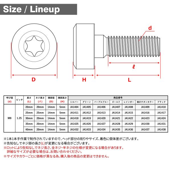 チタンボルト M8×30mm P1.25 低頭 ローヘッド トルクス穴 キャップボルト グリーン 1個 JA1419