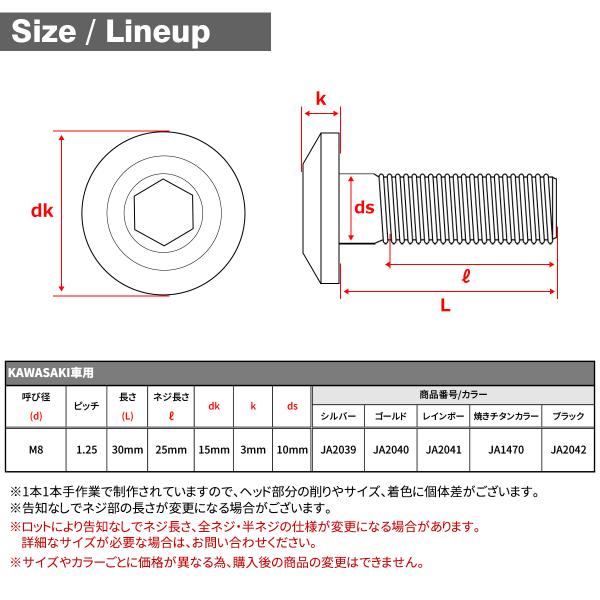 64チタン ブレーキディスク ローター ボルト M8×30mm P1.25 六角穴 カワサキ車用 KAWASAKI ゴールドカラー JA2040