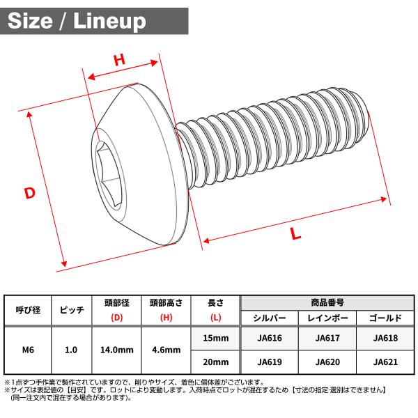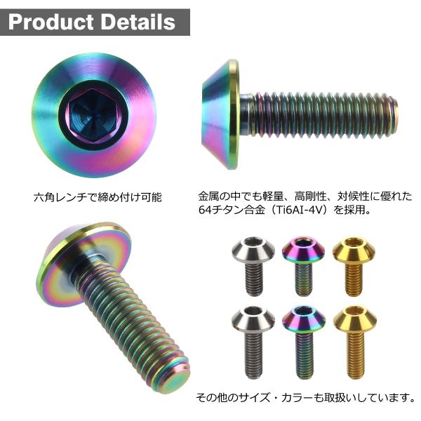 チタンボルト M6×20mm P1.0 テーパーヘッド 六角穴 ボタンボルト レインボー 1個 JA620