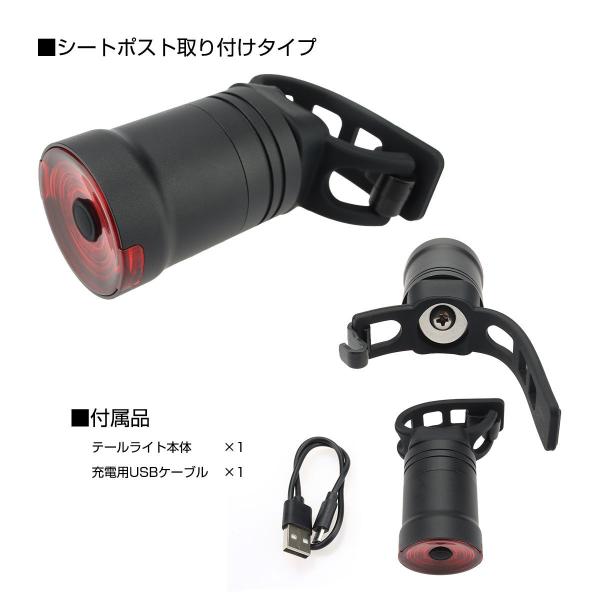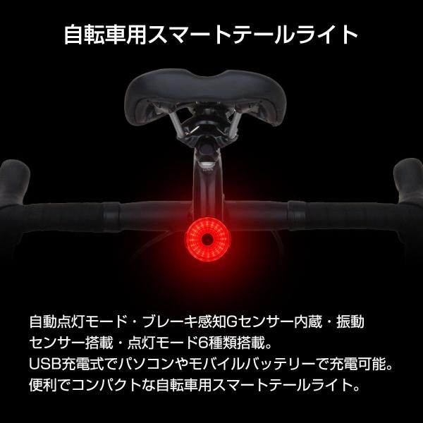 自転車 テールライト LED 自動点灯 USB充電式 ブレーキランプ機能付き クロスバイク 発光6パターン