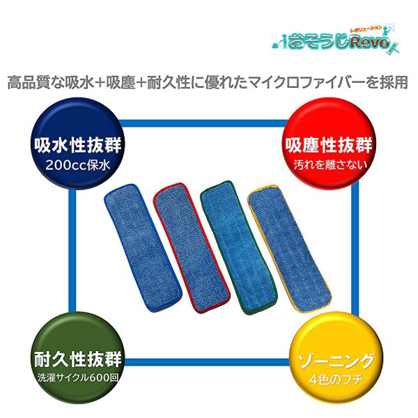・モップのフチが4色(青・赤・黄・緑)で使う場所に分けてゾーンニングが可能