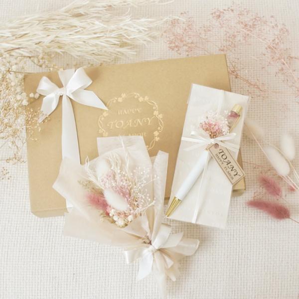 ハーバリウムボールペンも、ミニブーケラッピングをしてギフトボックスにお入れします。