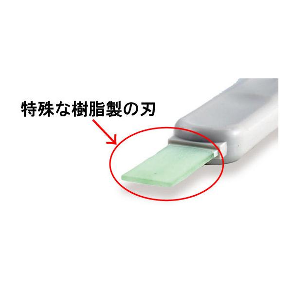 特殊な樹脂製の刃が頑固な水アカ、尿石を小さい力で除去します。金属製のスクレイパーと違い、陶器にキズを付けにくい特性を持っています。
