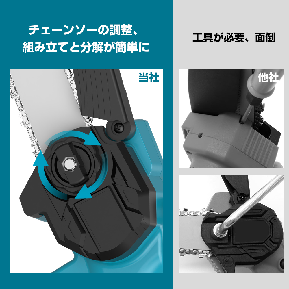 付属品:8インチチェーンソー* 1、ソーチェーン* 1、PSE認定充電器* 1、チェーンソーオイル容器、ドライバー* 1、取扱説明書* 1、収納箱*1