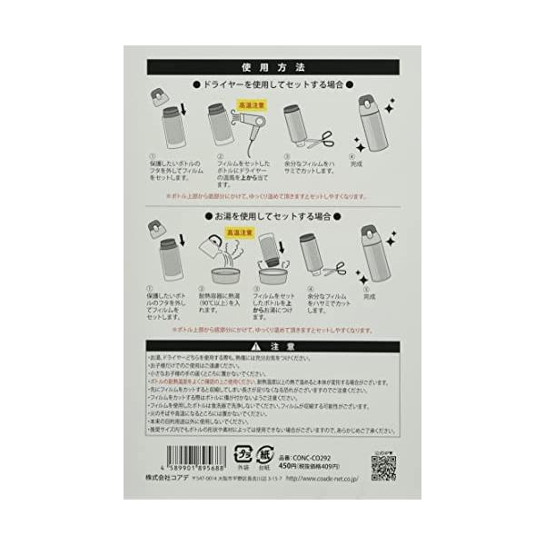 ※推奨サイズ内でもボトルの形状や素材によっては使用できない場合がありますので、あらかじめご了承ください。※本商品は熱を加えて収縮するフィルムとなっておりますため、熱や温水が出る食洗器等のご使用はお控えください。