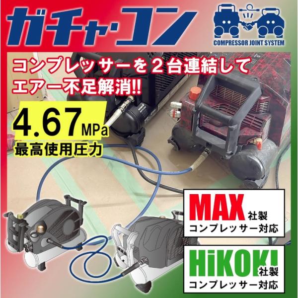 タンク内の圧力が2.0MPaを下回ってくると75mmや90mmの釘が浮いてくるので、待ち時間を無くし効率良く作業を進める為に連結が有効。