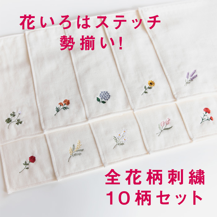 今治タオル ハンカチ 刺繍 25×25cm レディース 10柄セット 花いろは ステッチ ガーゼ 個包装 ギフト プレゼント まとめ買い 送料無料 退職 転勤 お礼