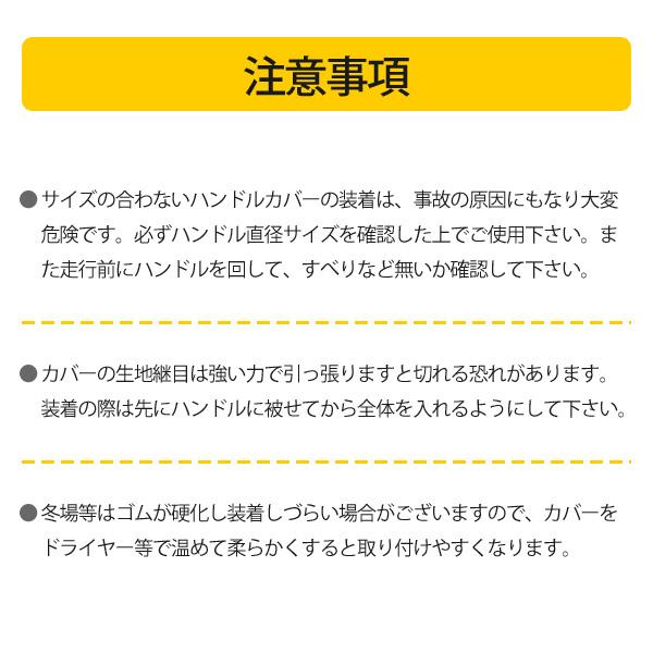 ※サイズの合わないハンドルカバーの装着は、事故の原因にもなり大変危険です。必ずハンドル直径サイズを確認した上でご使用下さい。また走行前にハンドルをまわして、すべりなど無いか確認して下さい。