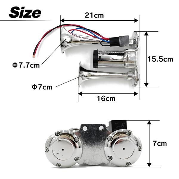 エアホーンキットには2つのトーン(高音と低音)があり、一緒に使用することで150dBの強力な音を作り出します。