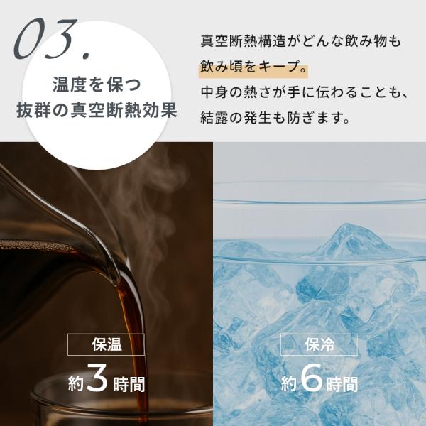 また、真空断熱構造により、温かさ・冷たさが長持ち。(保温3時間、保冷6時間)