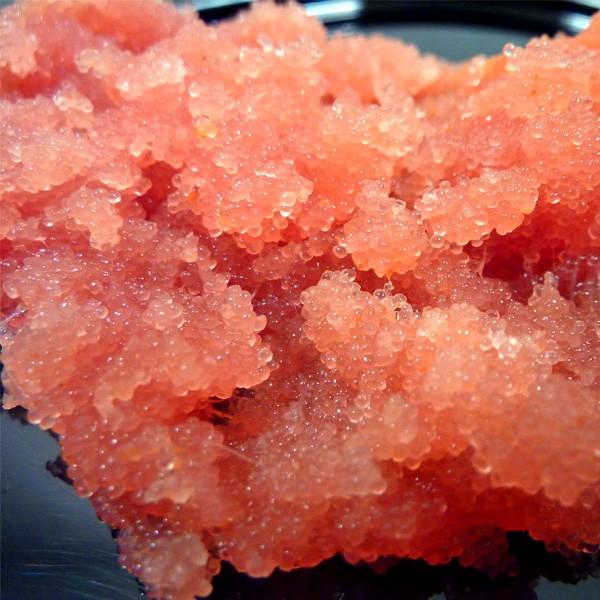 ■原材料/アメリカ産スケトウダラ卵、米発酵調味液、食塩、たん白加水分解物、唐辛子、柚子胡椒、調味料(アミノ酸等)、ソルビトール、酸化防止剤(ビタミンC)、ナイアシン、酸味料(クエン酸)、発色剤(亜硝酸Na)、着色料(赤102、104)