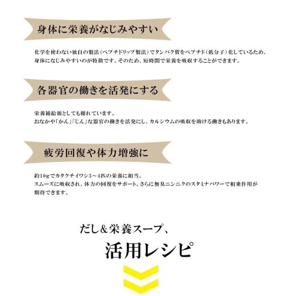 魚肉ペプチド・魚由来カルシウム・各ミネラル・各種機能性成分・うまみ成分「100%天然素材」で作られたペプチド栄養スープです。