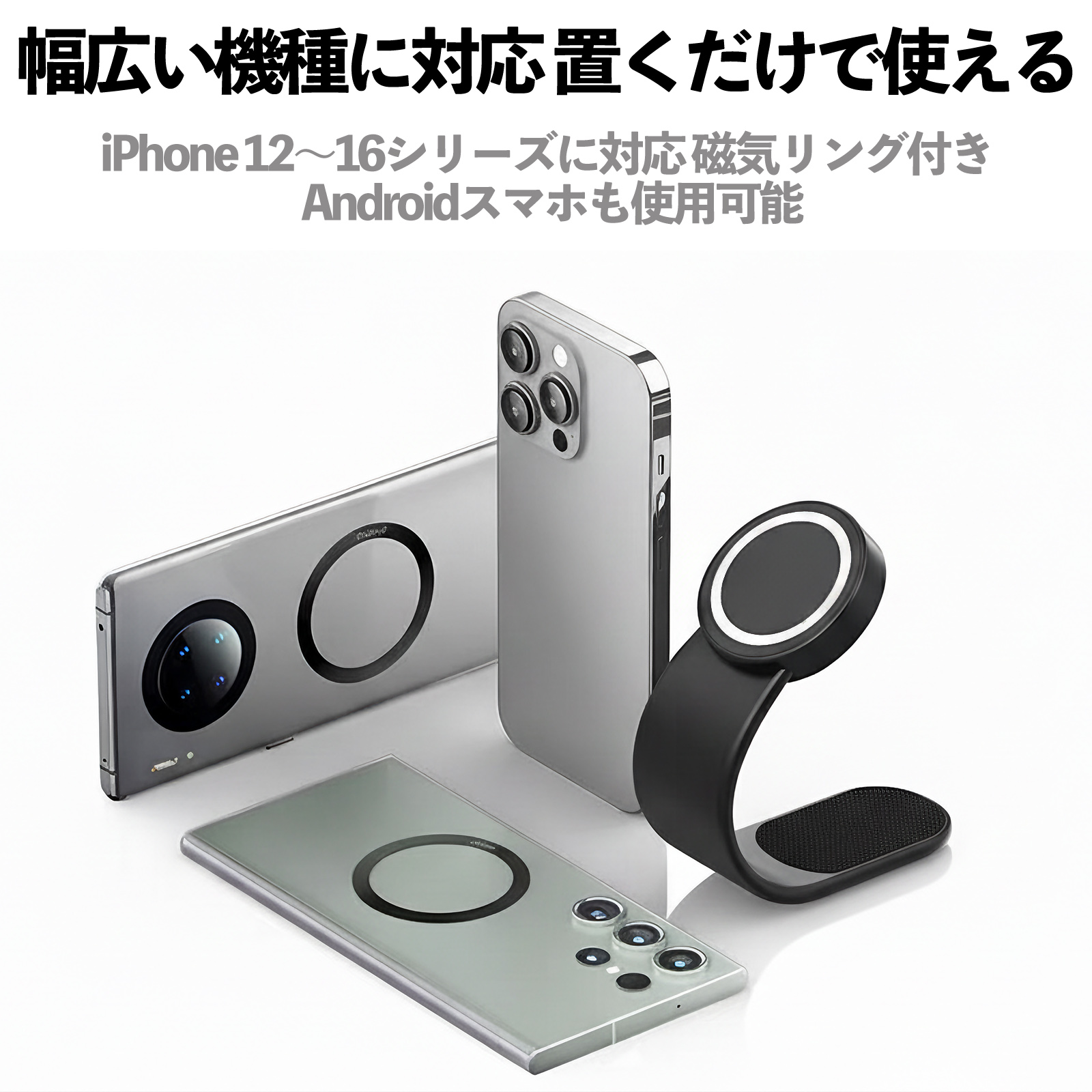 N55磁石16個でスマホを瞬時に固定。形状記憶アルミアームで角度自由調整。最大15Wワイヤレス充電対応で安定充電。平面・曲面・垂直面に設置可能。