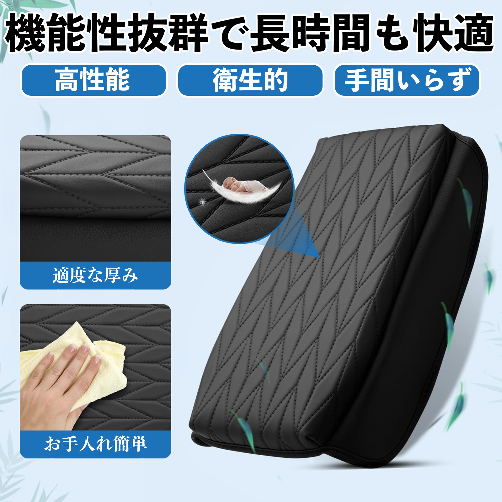 柔らかく耐久性のあるナッパレザー調素材とメモリーフォームで肘を快適に支える。車内を上品に演出。