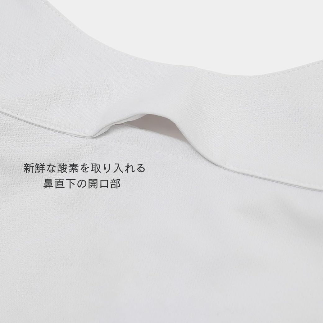 顔の形に沿った立体縫製でぶかつきや締め付けがなく、鼻下に呼吸孔付き構造で息苦しくない仕様になっています。