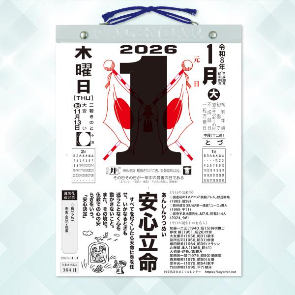 ●壁掛け日めくり一日1ページ365日タイプ ●きれいに剥がせるミシン目付 ●旧暦・六曜・九星・節気・月の満ち欠け入り ●「四字熟語解説」「今日の出来事」「名言・格言」「誕生花・花言葉」「今日が誕生日の有名人」など、盛りだくさんの有益情報満載! ●365日描き下ろしの見て楽しいイラスト入り!●別冊として、日めくりは破っても四字熟語は残る全365語を収録した「保存版・小冊子(B5判32頁)」同梱! ●業界最大手「新日本カレンダー社」提携品 ●幅19cm×縦26.5cm 厚さ2cm(369枚綴)重量635g/透明シュリンクフィルム包装。