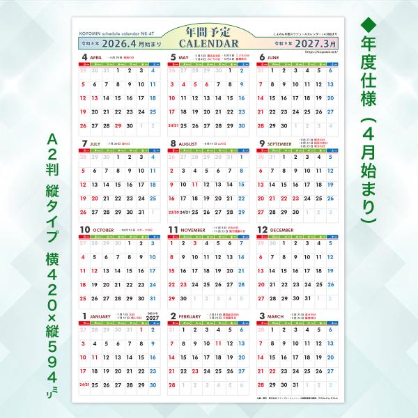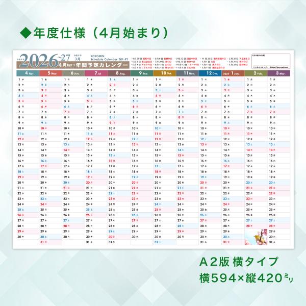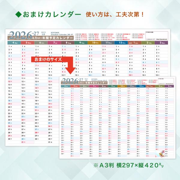 2026年◆4月始まり『年間スケジュールカレンダー』縦横2点セット+おまけA3横型カレンダー