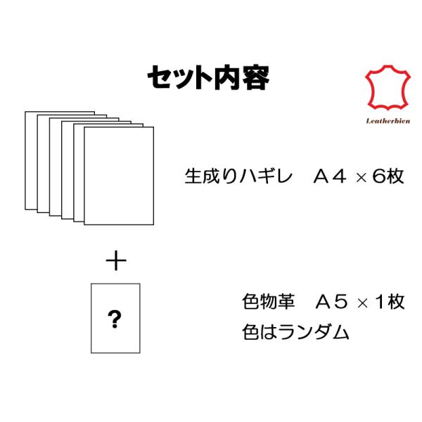 A4サイズの生成りのヌメ革6枚に、さらにA5サイズ色革1枚をお付けします(色はランダム)。