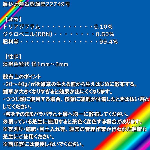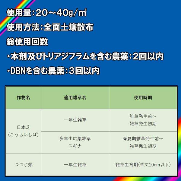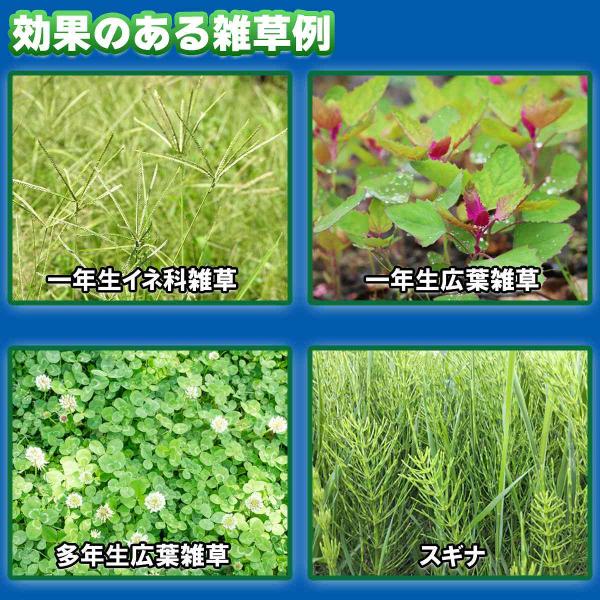 クローバー、タンポポ等の多年生広葉雑草だけでなく、メヒシバやスズメノカタビラ等の一年生イネ科雑草にも効果を発揮します(雑草発生前から発生初期まで)。