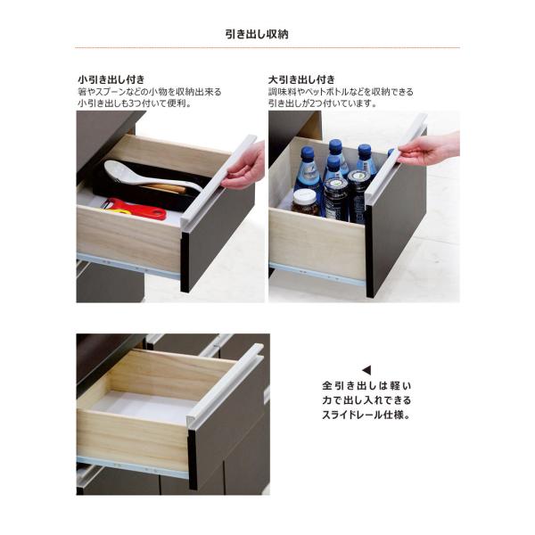 引き出し収納を備え、食器や調理器具、食品ストックをすっきり整理できます。