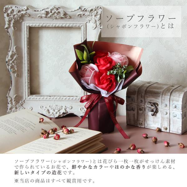 花びら一枚一枚がせっけん素材で作られたお花で、鮮やかなカラーやほのかな石けんの香りが楽しめる新しいタイプの造花です。