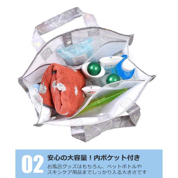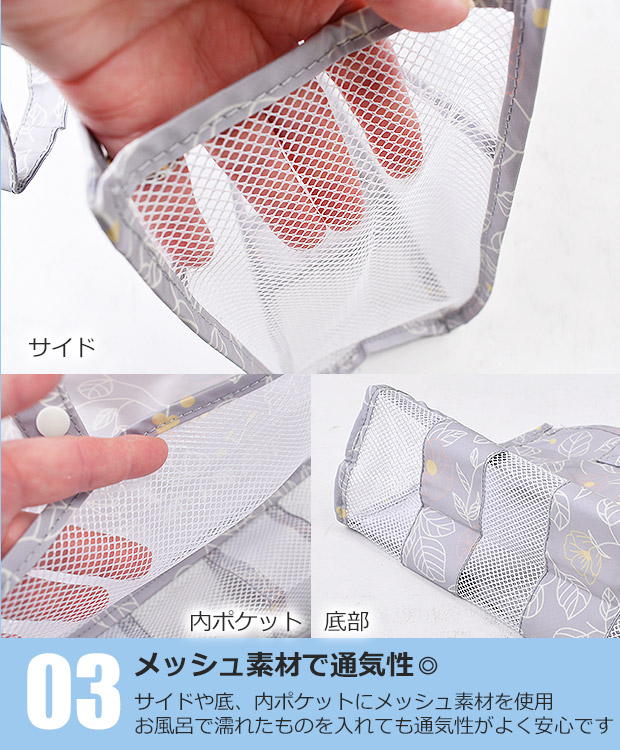 内側はメッシュ素材で通気性抜群、濡れたタオルや洗面道具を入れて持ち運びも楽々です。