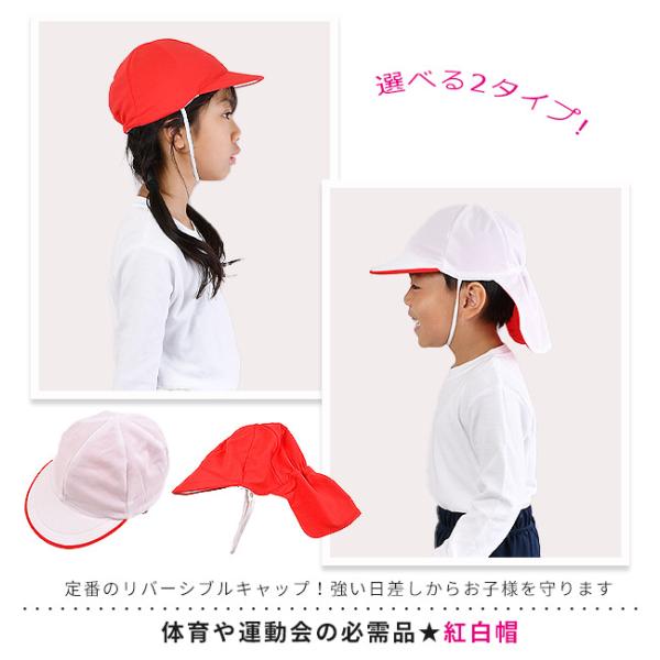 体育の授業や運動会に!定番の紅白帽子の登場です。通常タイプと日よけカバー付きの2タイプをご用意しております。メッシュ素材なので蒸れにくく、通気性に優れています◎型崩れしにくいポリエステル生地で、渇きも早くお手入れも簡単です!【送料無料】 紅白帽 紅白帽子 体育着 体操服 小学生 保育園 幼稚園 キッズ ジュニア 子ども 帽子 入学準備 スポーツ 運動 運動着 男女兼用 メッシュ素材 ボーイズ ガールズ アゴゴム付き リバーシブル 赤 レッド 白 ホワイト 紫外線●サイズ:M-L詳細は画像にてご確認下さいませ●カラー:全2種