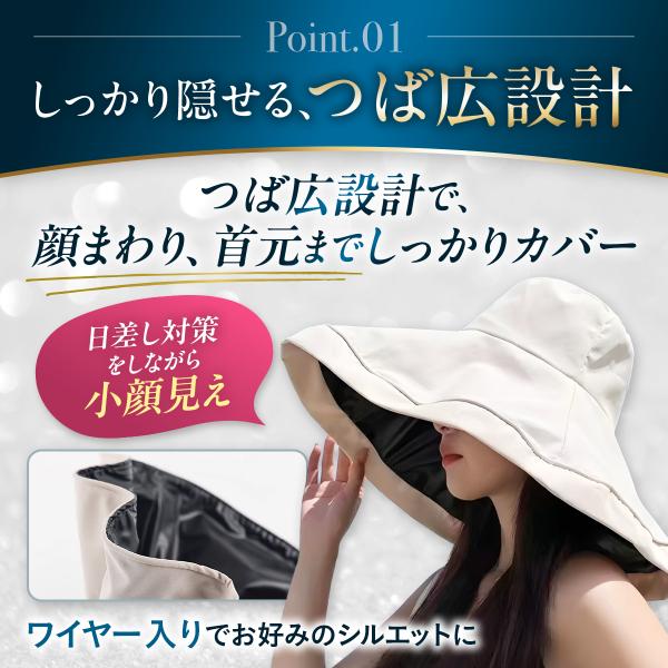 顔まわりをしっかり覆うワイドブリム設計