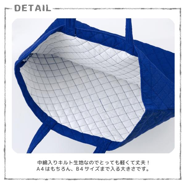 シンプルで使いやすい無地のキルティングレッスンバッグです。新しく人気色のインディゴが追加になりました!A4サイズはもちろん、B4サイズまで入る使いやすいサイズ。内側は中綿入りキルト生地を使用しているので、重さが約120gと軽くて丈夫。持ち手は肩にもかけられる長さになっています。通園・通学、習い事にはもちろん、普段使いにもおすすめです。カラー展開が豊富なのでお子さまのお好きなお色を選んでくださいね♪